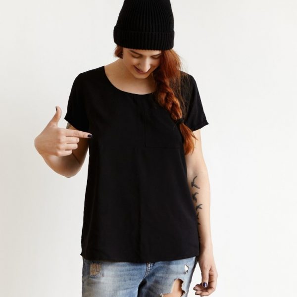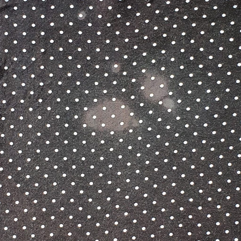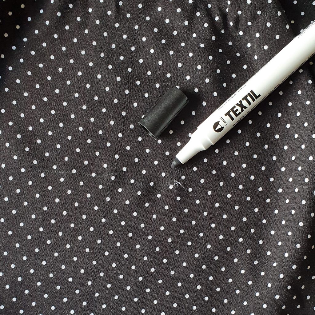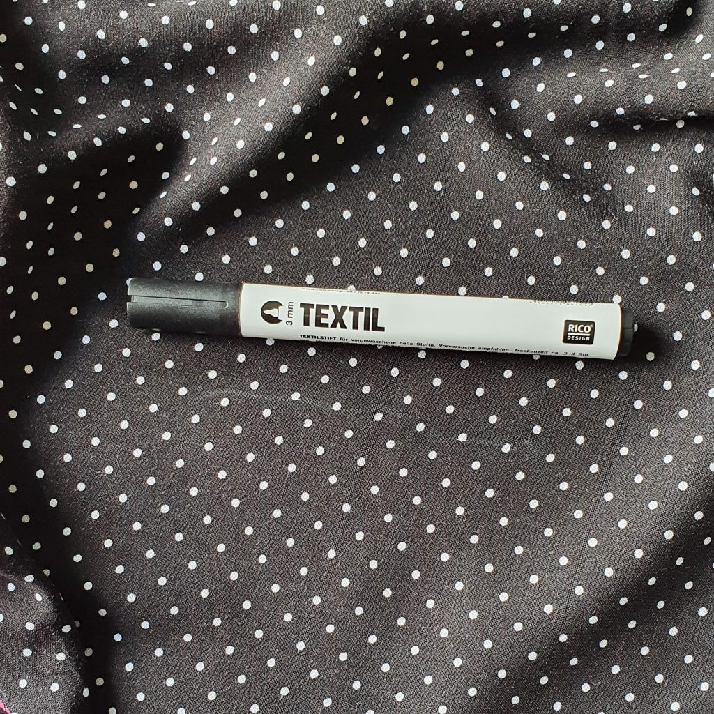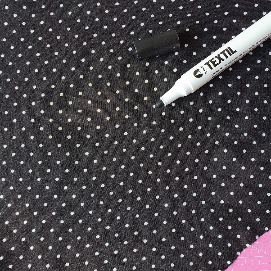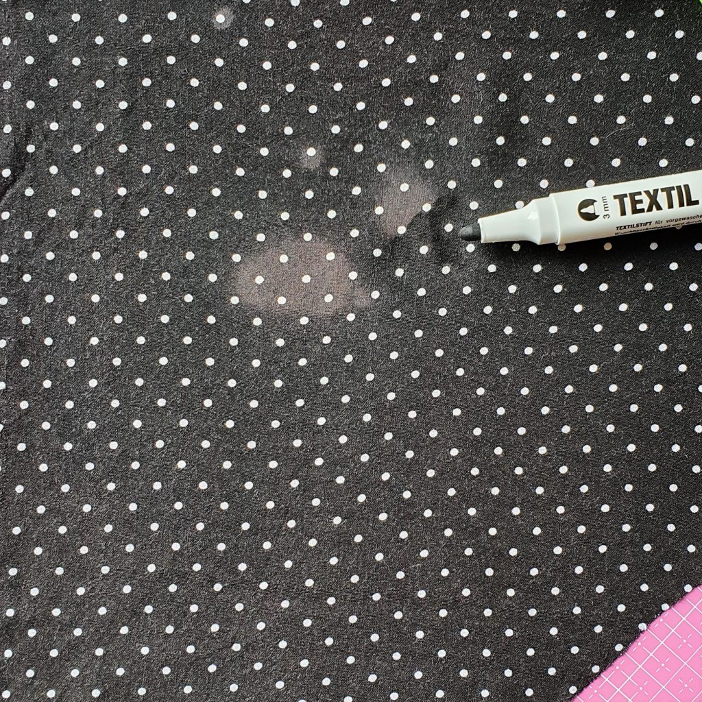 Wenn du gerne schwarz trägst, sollte ein schwarzer Textilmarker bei dir wohnen. Kleine ausgebleichte Stellen, die z.B. bei versehentlichen Spritzern mit Blondierung entstehen, kannst du damit ganz einfach kaschieren. Das ist besonders toll, wenn du nicht das ganze Kleidungsstück färben kannst, z.B. weil es gemustert ist wie hier unser Pünktchenstoff.