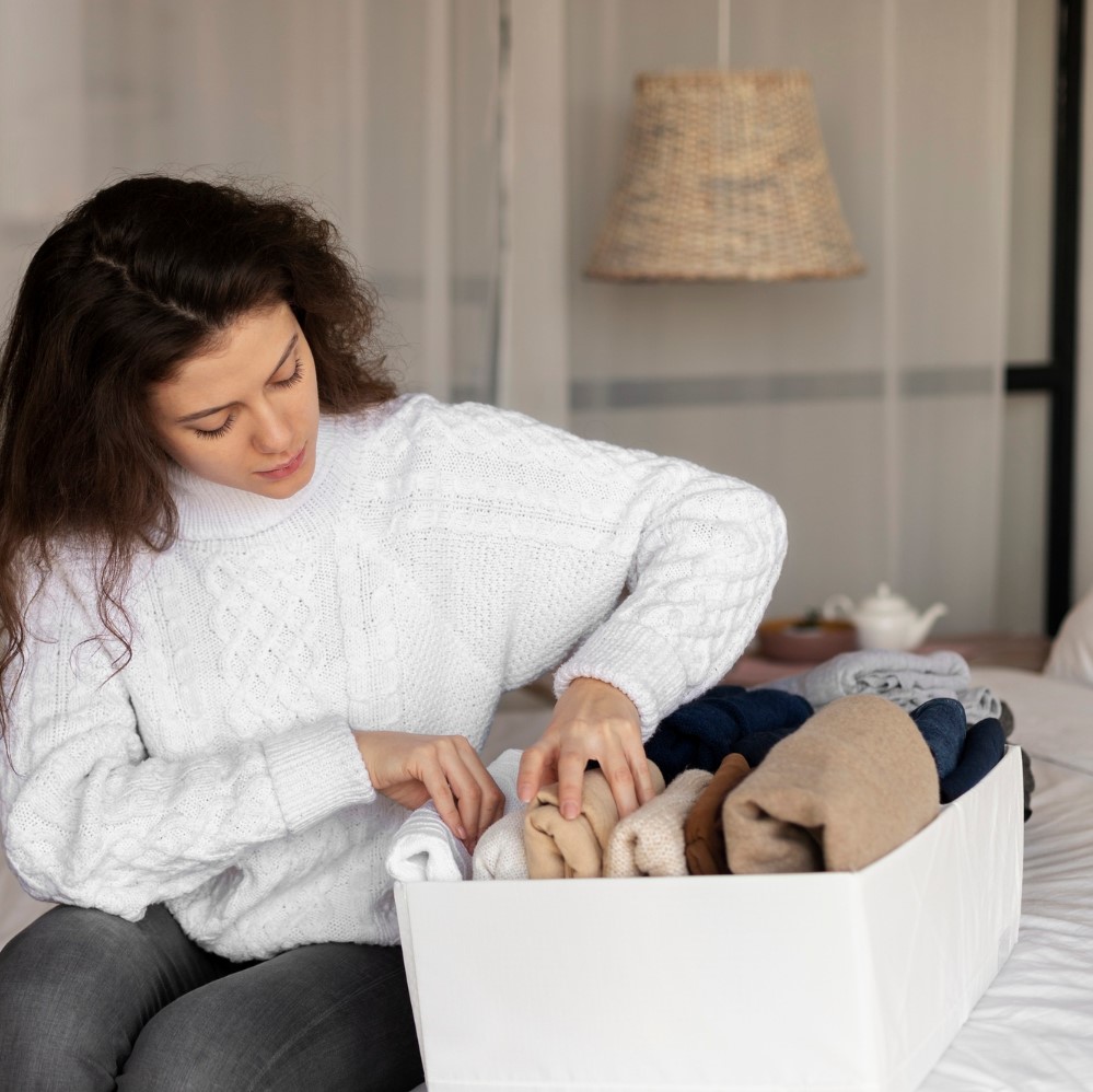 Bewahre deine Kleidung staubsicher, trocken und ohne größere Temperaturschwankungen auf. Durch diese kann sich nämlich Kondenswasser bilden, was zu Schimmel oder Stockflecken führen kann. Am Besten sind deine Klamotten in der Wohnung aufgehoben. Ob du eine eigene Kommode für deine Off-Season-Kleidung hast, die gute alte Unterbettkommode benutzt oder einen Koffer auf dem Kleiderschrank deponierst, ist dabei ganz dir überlassen. Idealerweise bewahrst du deine Kleidung liegend auf, v.a. Strick und Jersey behalten so ihre Form. Größere Teile wie den Wintermantel kannst du im Kleiderschrank hängen lassen und zum Staubschutz einen Kleidersack nutzen. Wenn du den Duft magst, stecke ein Lavendelsäckchen zwischen deine Klamotten, das hält Motten fern.
