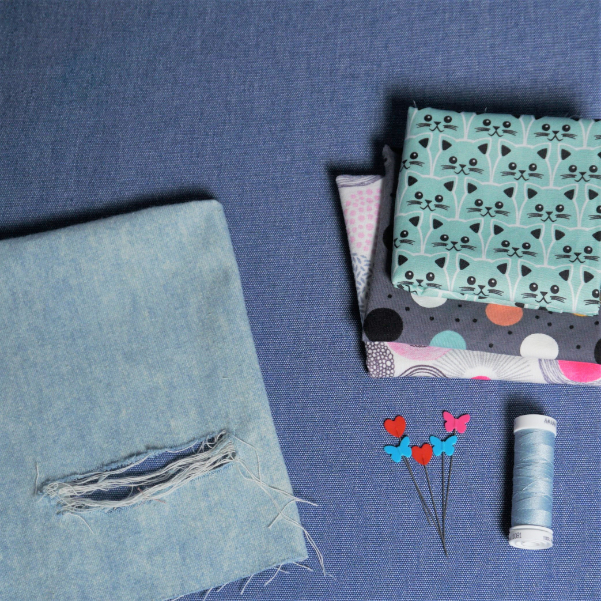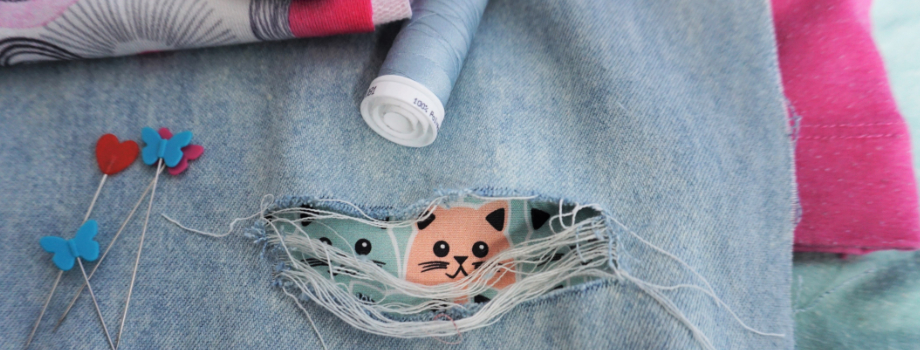 Du freust dich auf den Herbst, aber deine kaputte Jeans macht dir kalte Knie? Eine einfache und sehr hübsche Erneuerung deines distressed Lieblingsteils zeigen wir dir hier. Du hinterlegst die Löcher mit hübschem Stoff. Klar, dass unser Herz für den süßen Kätzchenstoff schlägt, du kannst aber auch jedes andere Muster nehmen.