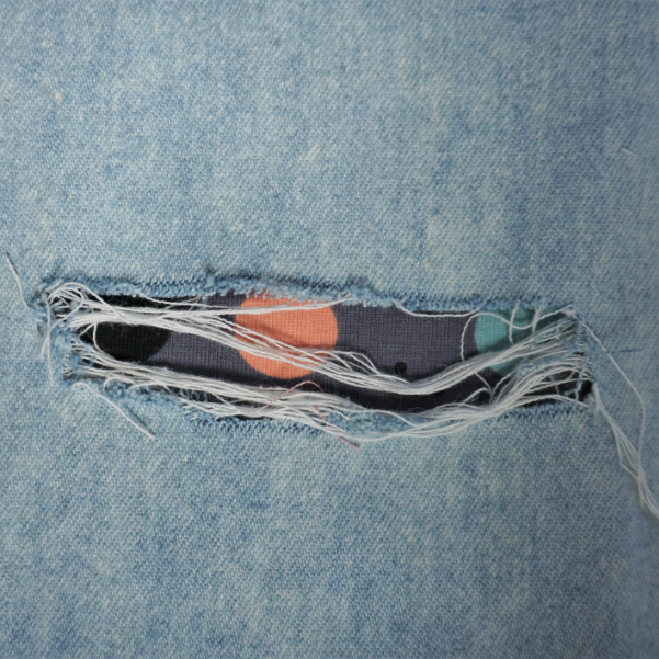 • Achte darauf, den Stoff nicht zu knapp zuzuschneiden. Meist sind die Löcher in der Jeans etwas unregelmäßig und der Stoff kann beim Festnähen etwas „wandern“.