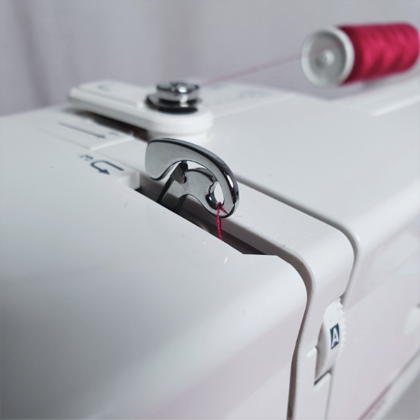 Kennst du beim Computer die Frage „Haben Sie ihn schon mal aus- und wieder angeschaltet“? So ähnlich ist das bei der Nähmaschine mit dem Oberfaden. Wenn der Faden reißt oder die Maschine schlaufen näht, fädle einfach den Oberfaden neu ein und schau, ob es dann funktioniert. Meist sind Pfeile zur Fadenführung aufgemalt, die dir die Richtung weisen. Achte besonders darauf, dass der Fadenhebel beim Einfädeln oben ist, damit du den Faden dort korrekt durchführen kannst. Drehe einfach das Handrad zu dir, sodass sich der Hebel nach oben bewegt.