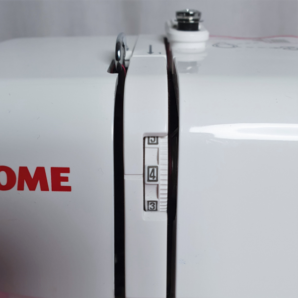 Mit dem Rädchen oben an deiner Nähmaschine stellst du die Oberfadenspannung ein. Je höher die Zahl auf dem Rädchen, desto höher die Fadenspannung. Drehe das Rädchen ein bisschen und schau, ob sich das Nahtbild verbessert. Ein guter Startpunkt ist der mittlere Bereich von 3 bis 5 – diese Zahlen sind auch bei den meisten Nähmaschinen markiert.