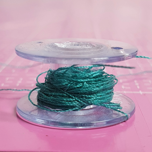 Schau dir zuerst die Unterfadenspule einmal genauer an. Der Faden sollte gleichmäßig und eng aufgespult sein und keine Schlaufen bilden. Sieht deine Unterfadenspule so aus wie auf dem Foto oder ist auch nur ein bisschen locker aufgerollt, spule den Unterfaden am besten neu auf. Wichtig: Lass deine Maschine die Arbeit machen und versuche nicht, den Faden mit den Fingern zu führen.