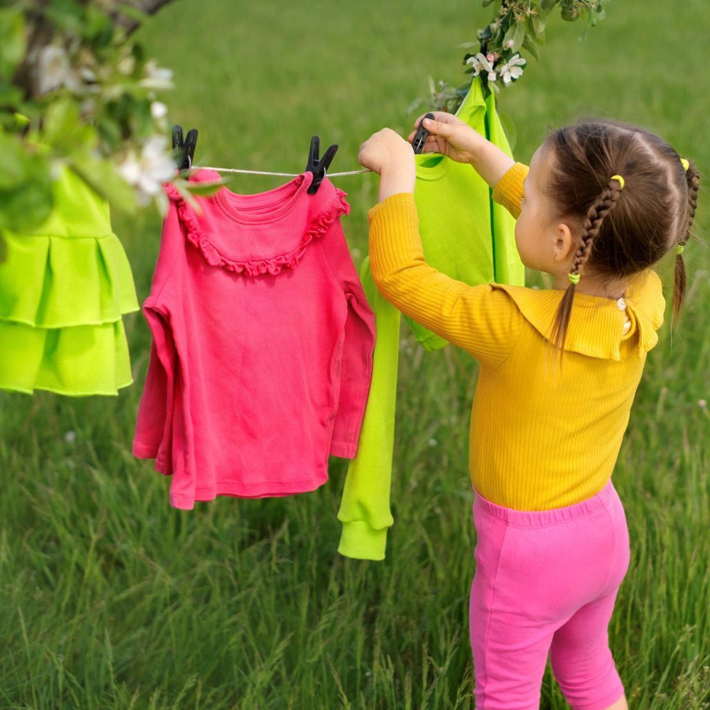Jede Runde in der Waschmaschine trägt zum Verschleiß deiner Kleidung bei. Wenn du nicht gerade als Handwerker*in arbeitest oder ein Kleinkind bist, ist deine Kleidung wahrscheinlich in den seltensten Fällen wirklich verschmutzt. Ab und zu mal eine Wäsche auszulassen, schont deine Kleidung und die Umwelt. Es ist wie bei Menschen: Ein Tag an der frischen Luft wirkt Wunder! 😉 Schüttle deine Klamotten ordentlich aus, um Haare, Hautschüppchen und Staub zu entfernen. Hänge sie anschließend draußen (z.B. auf dem Balkon) auf einen Kleiderbügel oder auf den Wäscheständer. Noch besser ist es, wenn dein Klamotten-Lüftungsplatz direkte Sonneneinstrahlung hat: UV-Licht wirkt nämlich desinfizierend. Achte in dem Fall aber darauf, deine Teile auf links zu drehen, damit sie nicht ausbleichen.